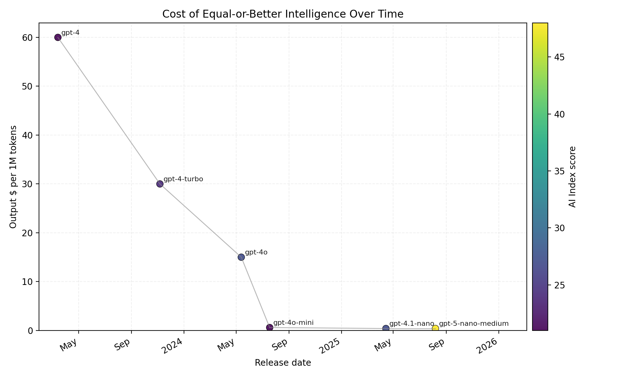 The total cost of getting responses from an equally intelligent AI has dropped 54.8x in the past year.